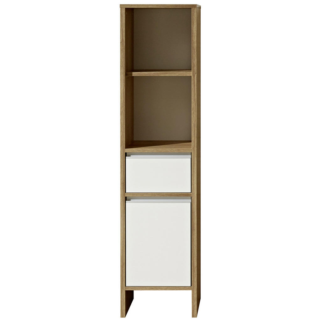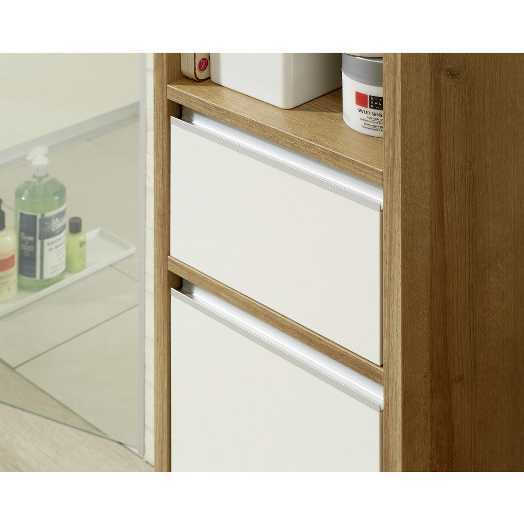 Kopalnica je nepogrešljiv prostor v vsakem domu. Dopolnite vašo kopalnico s čudovitimi omaricami, ki omogočajo dodaten shranjevalni prostor. Če kombinirate omarico z ostalimi kosi iz enake kolekcije, bo kopalnica postala čudovit, urejen prostor. Srednje visoka omara je del blagovne znamke Xora. Odlikuje jo eleganten in moderen dizajn. Izdelana je iz kakovostnih materialov. Sprednji del – fronta – je v beli barvi s sijajem, trup omarice pa je v barvi hrasta Riviera. Kombinacije temne naravne barve in nevtralne bele je čudovita. Ima 2 prostorni odprti polici, kamor lahko shranite kozmetične pripomočke ali brisače. Spodaj je še predalnik in omarica z enimi vrati. Dimenzije: 62x54x28 cm