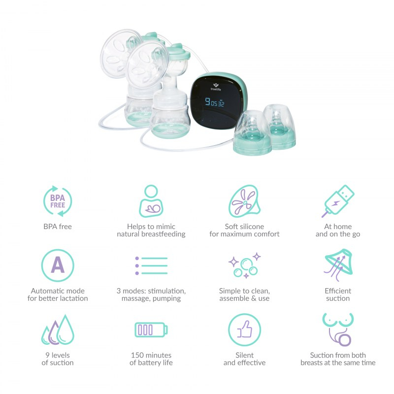 Električna prsna črpalka TrueLife Nutrio BP Electric Double je odličen dodatek za nego otroka, ki zagotavlja udobje vam in vašemu dojenčku. Črpalka črpa mleko iz obeh prsih hkrati in vam tako pomaga reševati trenutno pomanjkanje ali pa obratno prebitek mleka hitreje, kot pa klasična črpalka. Poleg tega s pomočjo dvojne črpalke izčrpate v povprečju za 18 % več mleka, kot pa pri črpanju iz vsake prsi posebej. Z Nutrio BP Electric Double lahko mleko pripravite za kasneje, na primer, ko otrok spi ali pa ni lačen. V hladilniku vam takšno mleko zdrži do 48 ur. Črpalko lahko vzamete s seboj na potovanja, ne zavzame veliko prostora, enostavno se zloži in čisti. K dvojni črpalki lahko dokupite še poseben nedrček TrueLife Nutrio Bra za pritrditev, ki ga lahko uporabljate tudi za dojenje.
