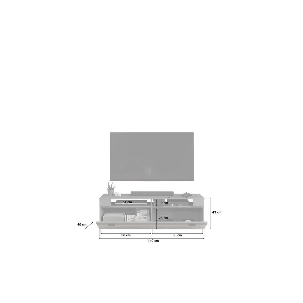 TV element MID.YOU združuje minimalističen dizajn, praktično zasnovo in nevtralne barvne tone, ki se brez težav vključijo v vsak sodoben ambient. Kombinacija sivega dekorja in poudarkov Nox hrast ustvarja moderen, a hkrati topel videz. Zaradi kompaktnih mer je idealna izbira tako za manjše kot tudi srednje velike dnevne prostore. Ključne prednosti: Moderen in čist dizajn, primeren za sodobne dnevne in jedilne prostore Veliko shranjevalnega prostora s štirimi notranjimi policami Praktična razporeditev z dvema vrtljivima vratoma za urejen videz brez nereda Enostavna montaža in nezahtevno vzdrževanje Izdelano iz FSC MIX certificiranih materialov, odgovorna izbira Lastnosti: Dimenzije: 140 x 42 x 40 cm