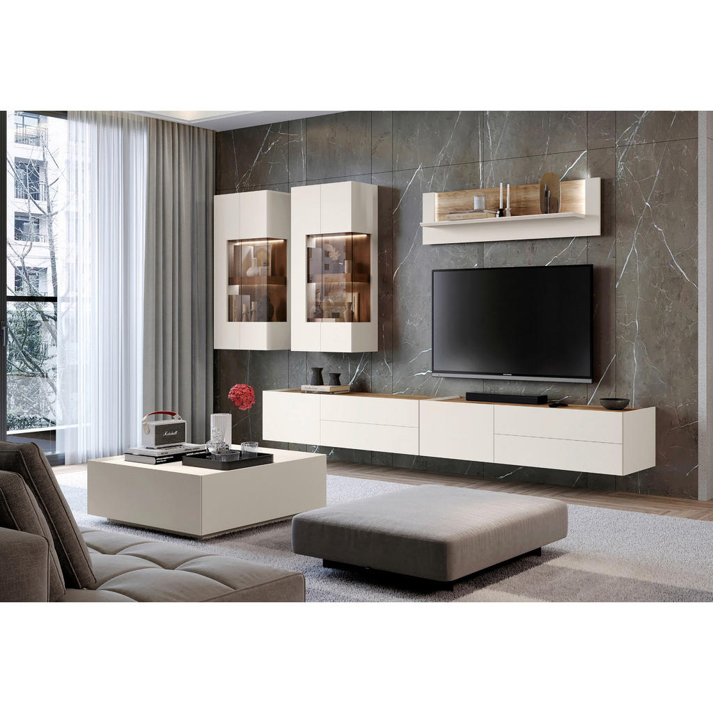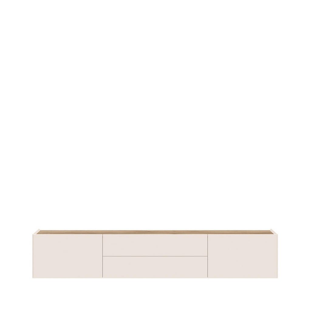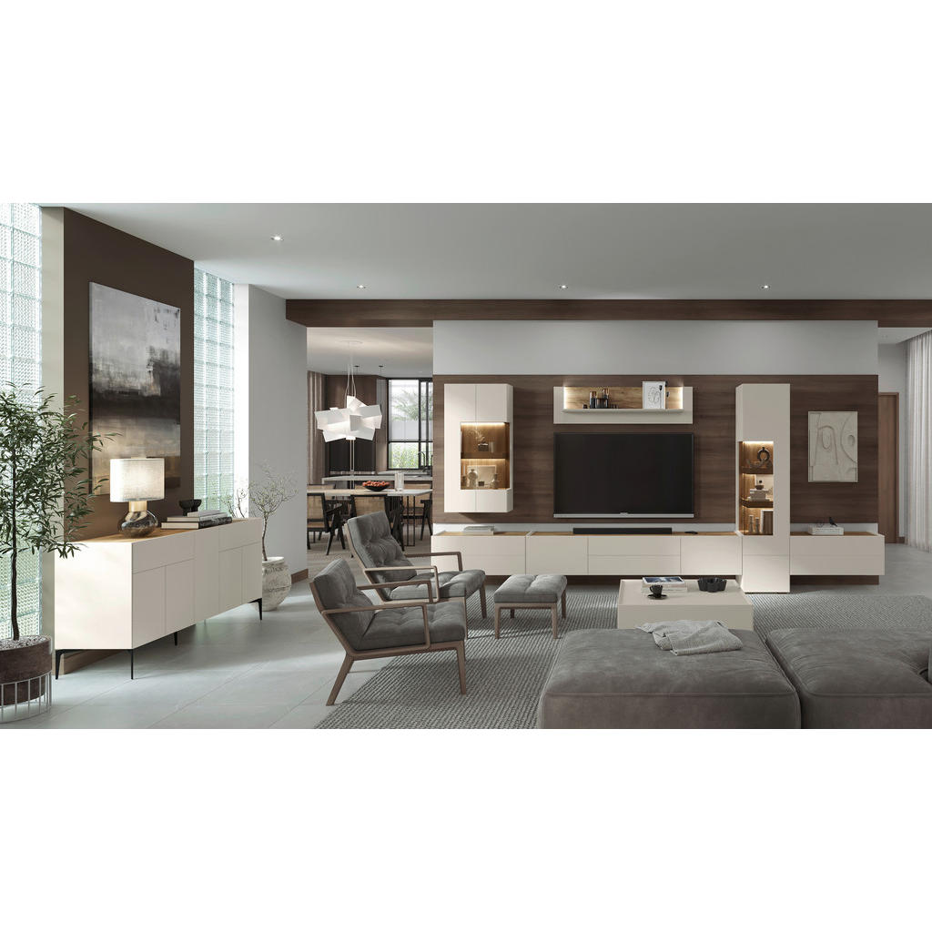 Predstavljamo vam eleganten TV-element, ki z minimalistično obliko in prestižno barvo kašmirja v prostor vnese sodoben mir in prefinjenost. Kombinacija mat lakirane MDF fronte in čistih linij ustvarja brezčasen kos, ki se odlično poda tako modernim kot tudi bolj umirjenim interierjem. Zasnovan je za funkcionalno uporabo, hkrati pa deluje kot estetski poudarek dnevne sobe. Ključne prednosti: Sodoben dizajn v barvi kašmir – mat lakirana površina deluje elegantno in luksuzno. Kakovostna izdelava – MDF fronta in stabilna konstrukcija iz lesnega materiala in kovine. Velik in prostoren TV-element – idealen za večje televizorje in urejen multimedijski kotiček. Čiste linije brez vizualnega šuma – popolna izbira za minimalistične in moderne ambiente. Lastnosti: Dimenzije: 206 × 37 × 47 cm (Š × V ×