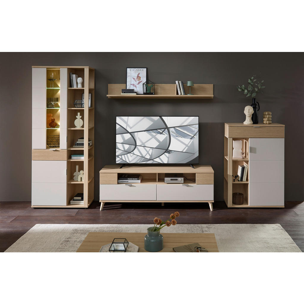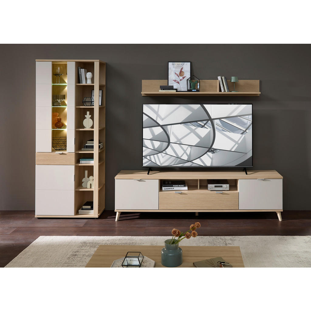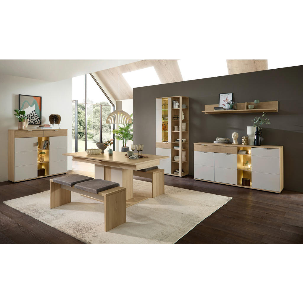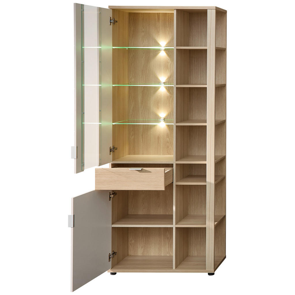 Zablagovno znamko Hom`inje značilen minimalističen dizajn s svetlimi, prijaznimi barvami.Namenjena je predvsem mladim in nudi ogromno odličnih izdelkov zaopremljanje prvega ali študentskega stanovanja. Pohištvo jefleksibilno in ga je mogoče medsebojno kombinirati, zajema pa širokspekter prostorov, med drugim dnevne sobe, jedilnice, pisarne terspalnice. Estetsko dovršena in visoko funkcionalna vitrina v barvah hrasta in kašmirja se ponaša s 7 odprtimi predali, 6 policami, dvojico vrat z levim odpiranjem ter notranjo osvetlitvijo. Izdelek predstavlja odličen način za organizacijo notranjih prostorov: odlično se poda predvsem dnevnim sobam in jedilnicam. Ključne prednosti: Enostavno vzdrževanje: Za čistočo zadošča občasno brisanje s suho krpo. Sistem za mehko in tiho zapiranje hrup ohranja na minimumu. Notranja osvetlitev dodatno ojača eleganco in pripomore k funkcionalnosti izdelka. Lastnosti: Dimenzije: Širina 80 cm, višina 202 cm, globina 38 cm Barva: Barve hrasta, kašmir, barve kroma, črna Število odprtih predalov: 7 Skupno število polic: 6 Materiali: Imitacija lesa (HDF, iverna plošča, MDF, folija z dekorjem), prozorno steklo, kovina