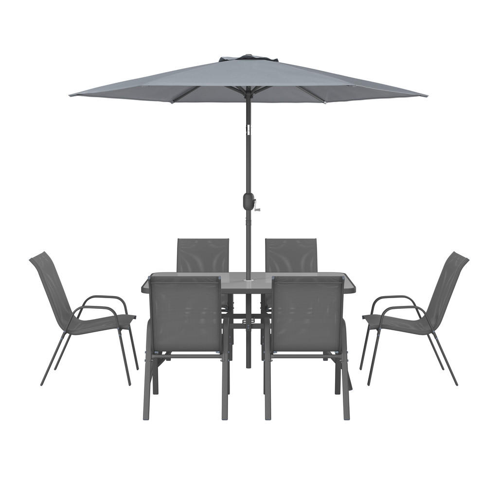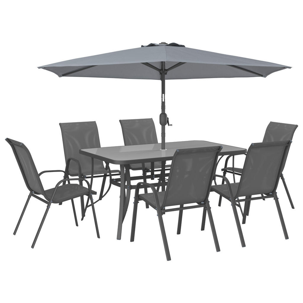 Popolna izbira za brezskrbne trenutke na terasi ali vrtu! Popestrite svoj zunanji prostor s stikskim vrtnim setom Xora in si v enem koraku priskrbite vse kar potrebujete za poletna druženja: udobni stoli, velika miza in praktičen senčnik. Idealna izbira za sproščene poletne večerje ali družinska srečanja na prostem. Ključne prednosti: Udobje in vzdržljivost – 6 ergonomsko oblikovanih stolov z nosilnostjo do 140 kg Vrhunski materiali – prašno lakirano železo za vzdržljivost in odpornost proti vremenskim vplivom Steklena miza – kaljeno varnostno steklo za dodatno stabilnost in eleganco Zaščita pred soncem – set vključuje senčnik z razponom 270 cm Sodoben dizajn – elegantna kombinacija svetlo sive in temno sive barve Lastnosti: Material: železo, tekstil (100 % poliester, Texteline), kaljeno steklo Površinska obdelava: prašno lakirano železo, barvno kaljeno steklo Dimenzije mize: 150 x 70 x 90 cm (š x v x g), maks. obremenitev 60 kg Dimenzije stolov: 54 x 70 x 90 cm (š x v x g), maks. obremenitev 140 kg Vključuje: 6 stolov, 1 mizo, 1 senčnik